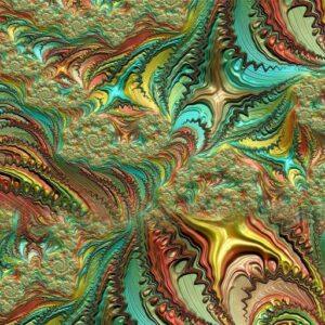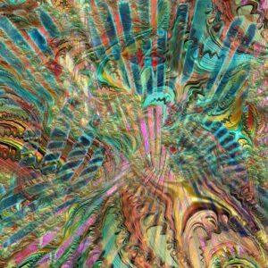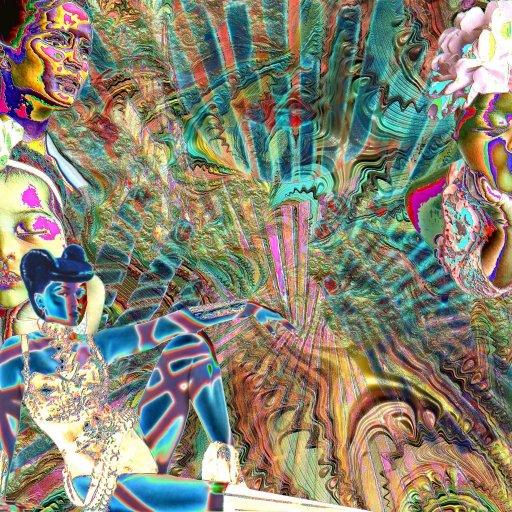 L’image présente une composition très psychédélique et saturée en couleurs, mêlant des silhouettes humaines et des motifs abstraits. On y distingue plusieurs figures féminines au style rétro ou futuriste, dont les visages sont en partie déformés, métallisés ou auréolés de reflets néon. Les textures semblent liquides et tourbillonnantes, évoquant des vagues ou des marbrures aux tons vifs – rose, turquoise, vert acide, doré. À l’avant-plan, une figure stylisée en bleu et blanc adopte une pose de cabaret, décorée d’éléments scintillants. L’ensemble donne une impression de collage numérique où se croisent glamour, surréalisme et esthétique cyberpunk, créant un univers visuel foisonnant et hypnotique.